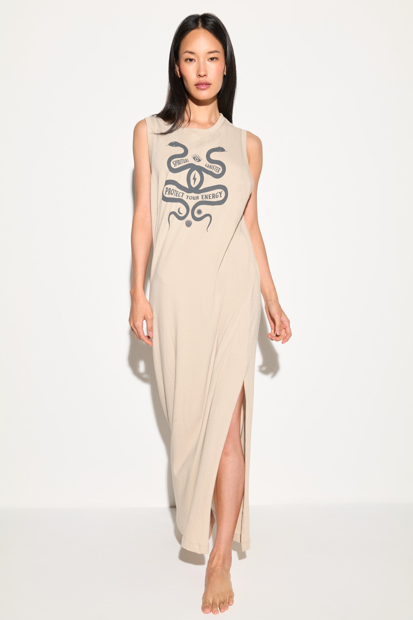 Protect your energy — the Spiritual Gangster mission statement + free flowing maxi dress in one. Rock the look for travel days or morning meet-ups at the juice bar. No matter where you roam, the vibe is effortless.